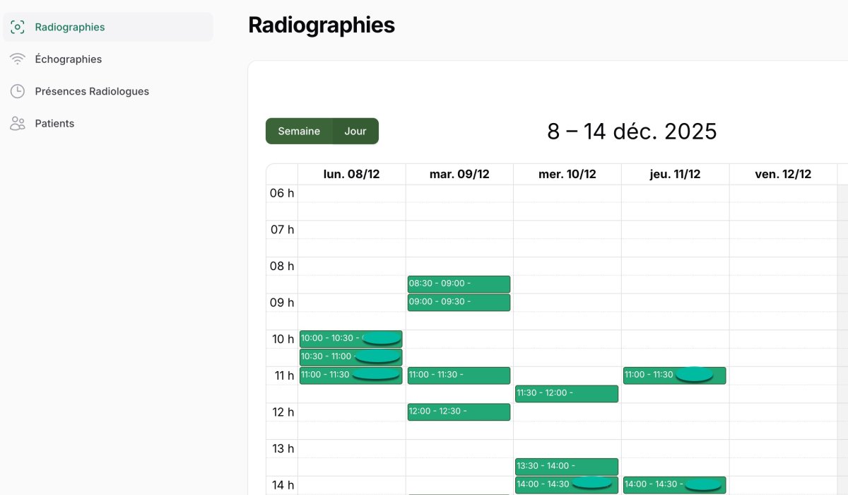 • Affichage jour ou semaine selon vos besoins • Filtrage par modalité (RX, Echo, CT, etc.)